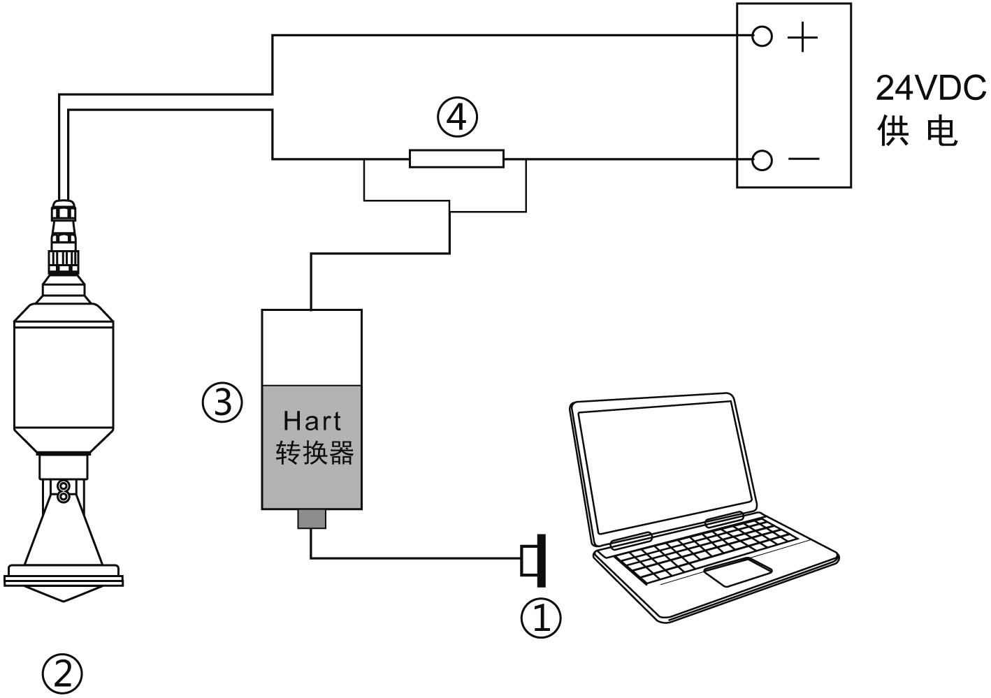 ①RS232 interface/USB interface ② Radar level meter ③ HART converter ④ 250Ω resistor